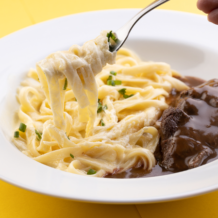 Macarrão talharim, na fonduta (creme branco) de parmesão, com filé de alcatra angus ao molho madeira. > escreva nas observações o ponto da carne.