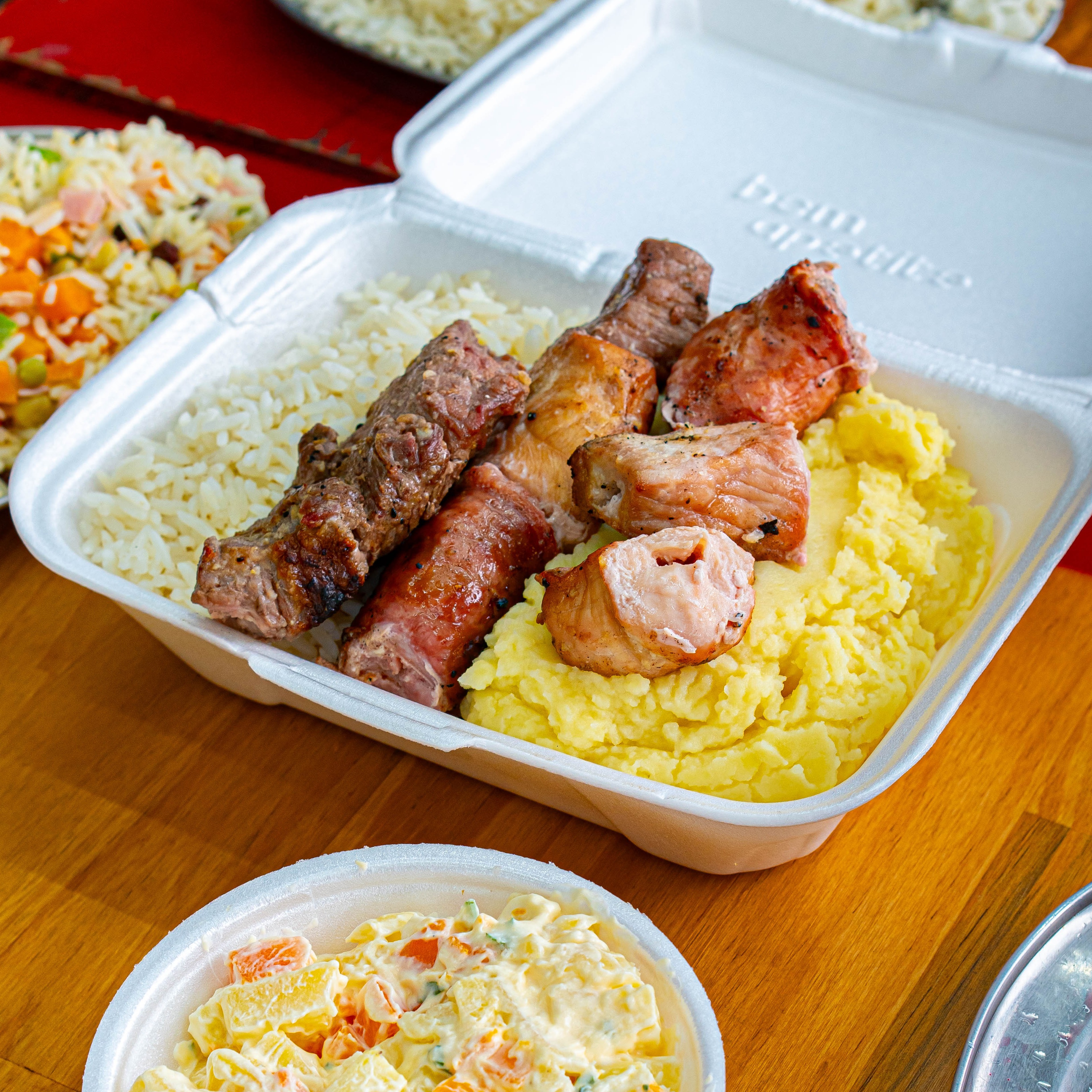 Churrasquinho de carne bovina, frango, linguiça e lombinho acompanhado de até 4 complementos