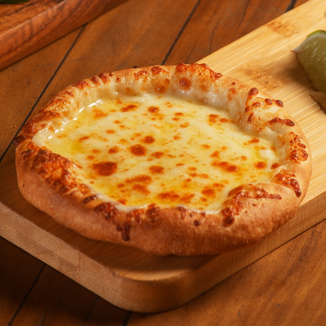 Muçarela derretida acompanhada de ovo ralado com bacon suculento em cubo