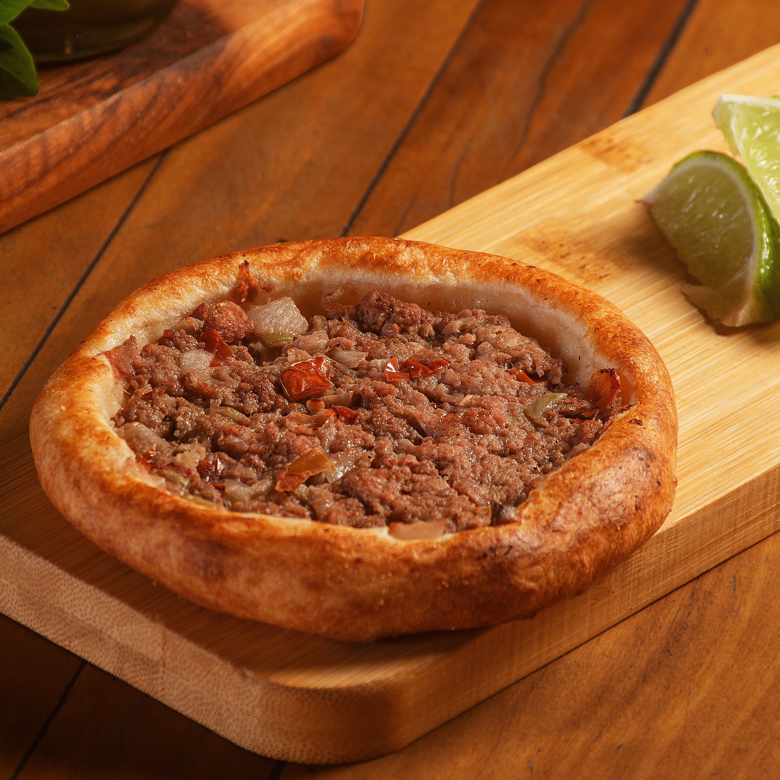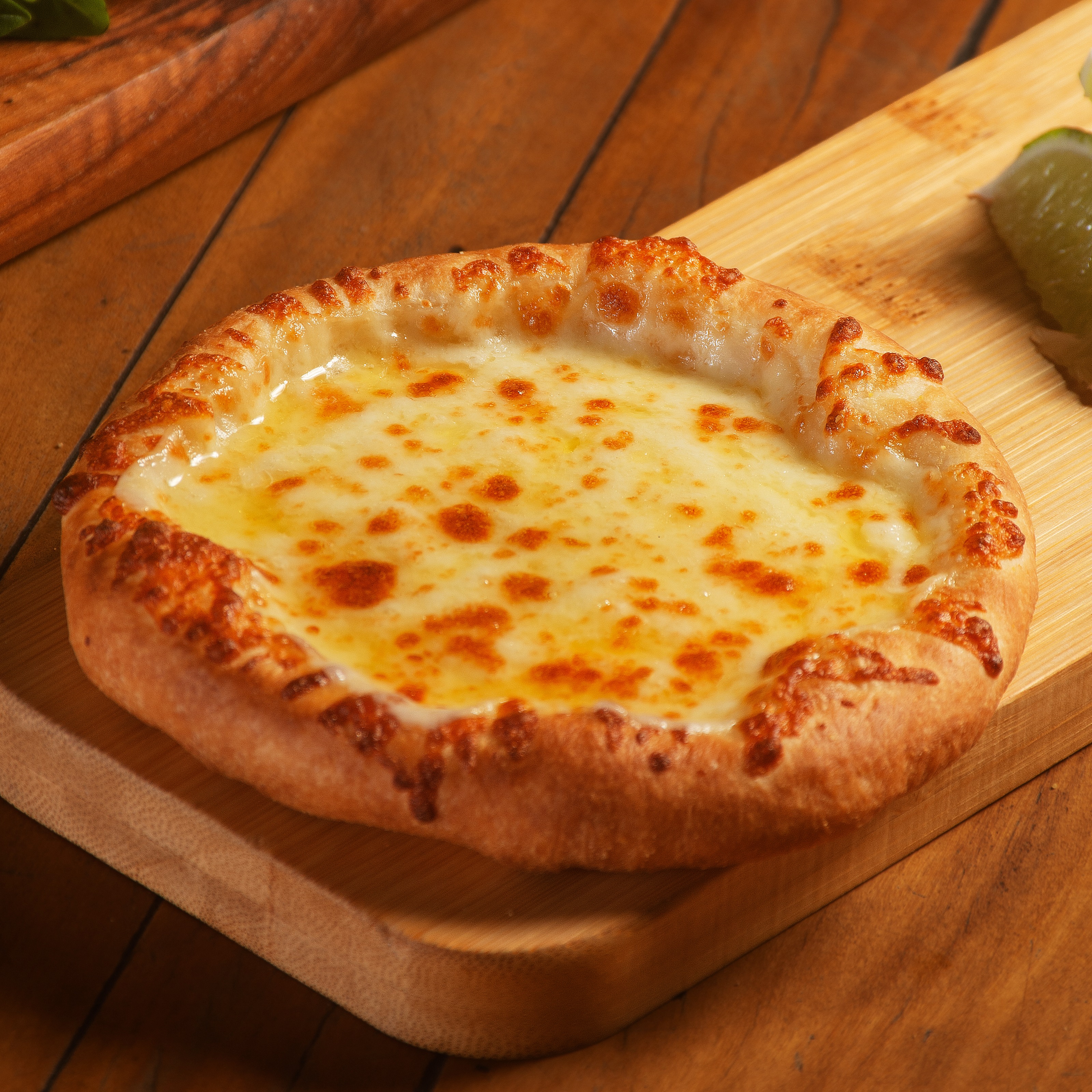 Muçarela derretida acompanhada de ovo ralado com bacon suculento em cubo