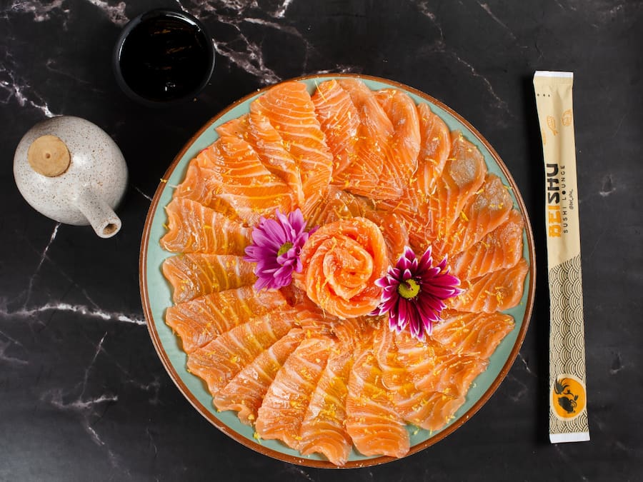 Selecionadas Lâminas de Salmão, azeite italiano trufado, raspa de limão siciliano, flor de sal. Aprox 30 laminas.