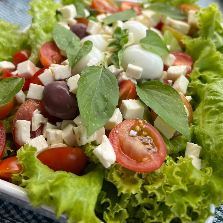Alface, tomate cereja, queijo branco, ovos de codorna, azeitona preta e manjericão.