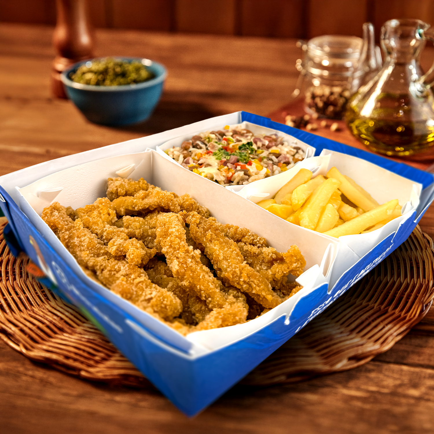 Tiras de frango temperadas com ervas frescas e especiarias, fritas até ficarem douradas e crocantes. Acompanhadas do sensacional baião de dois e batata frita.