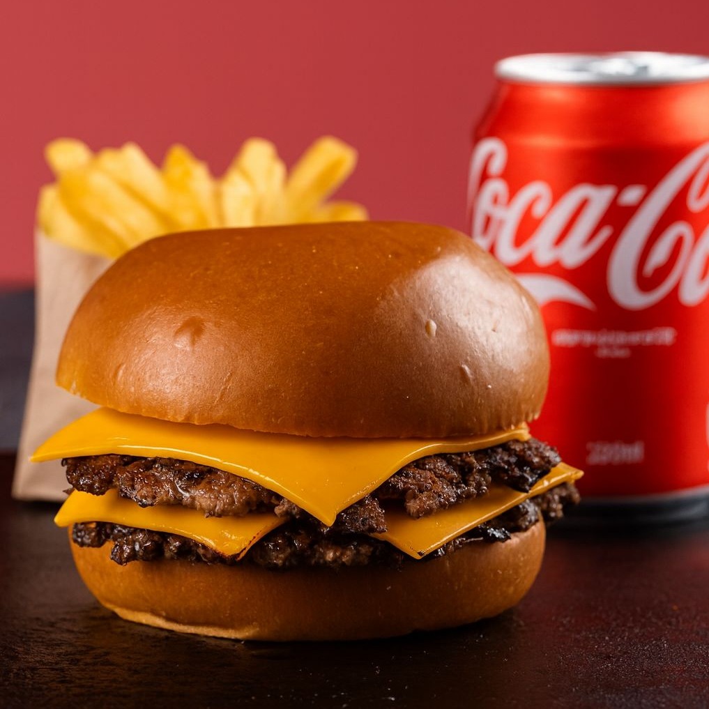Pão brioche, 2 smashs de 50g cada e queijo cheddar Coca cola 350ml lata Batata fritas (100g)
