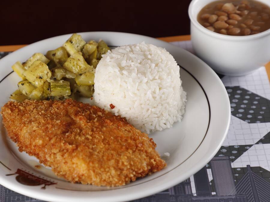 Frango empanado na farinha panko + arroz + feijão + 1 acompanhamento à sua escolha (fritas, farofa, refogado do Dia ou purê)