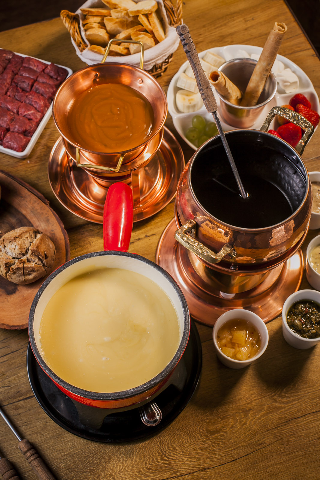 A fondue de carne (400gr) tem seu preparo no consume de vinho. Sugerimos nesse combinado que você use dois rechauds simultaneamente. Acompanha 6 pães, cada de 65gramas, sendo 2 de Campagne (centeio com nozes), 4 italianos. IMPORTANTE: Para garantir a total qualidade dos pães, eles devem ser assados por 4min em forno pré-aquecido a 180graus. As fondues doces acompanham banana, uva, morango, marshmallow e cucurucho de waffle. Escolha a fondue de queijo e doce (350gr) de sua preferência (1 de cada). Porção recomendada para 2 pessoas.