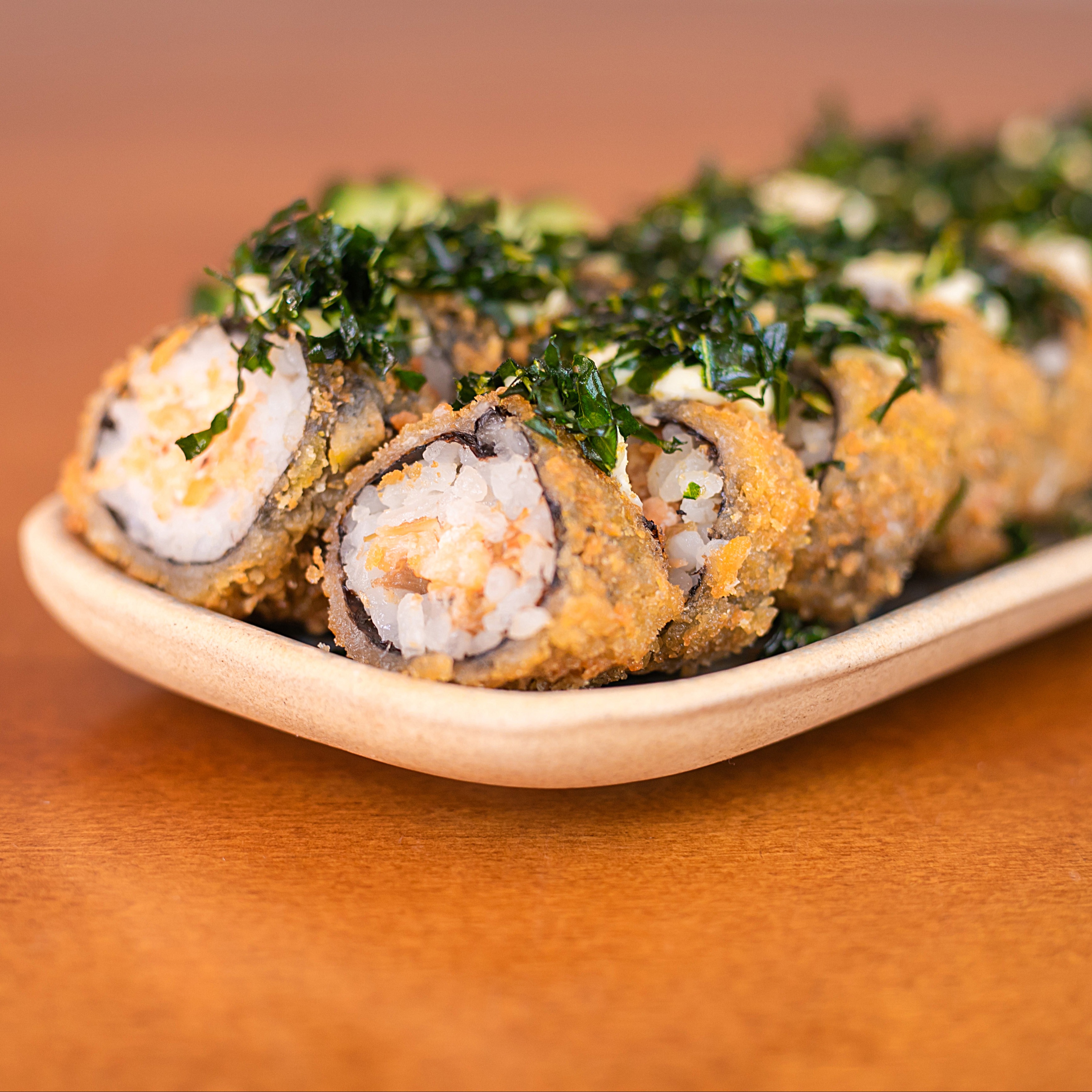20 peças de enrolado frito com arroz e recheio de salmão coberto com cream cheese e molho tarê.