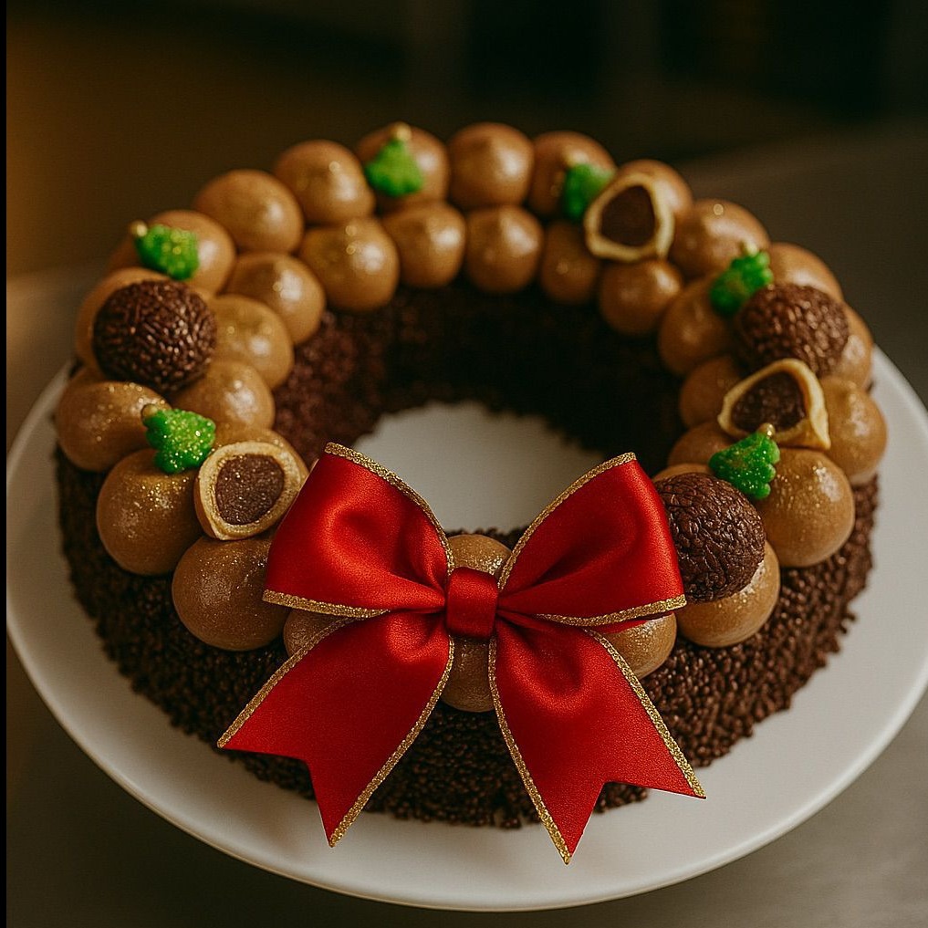 Um delicioso brigadeiro cremoso, Coberto com granulado. Confeitado com bombons ouro branco, brigadeiros e mini árvore natalina.