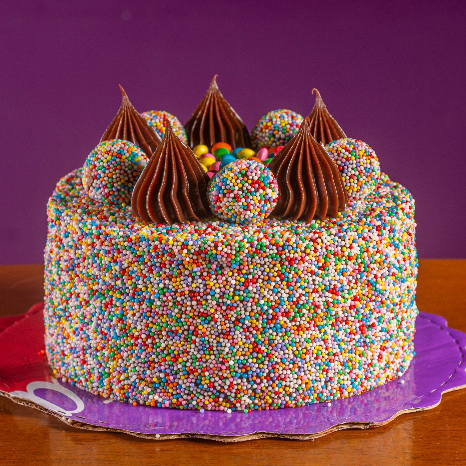 Bolo de chocolate mega recheado com brigadeiro e coberto com miçangas coloridas. REFERÊNCIA DE TAMANHOS - Mini: 11cm de diâmetro. Rende 5 fatias. Entre 480 e 520g. - P: 16cm de diâmetro. Rende 10 fatias. Entre 1,1kg e 1,2kg.