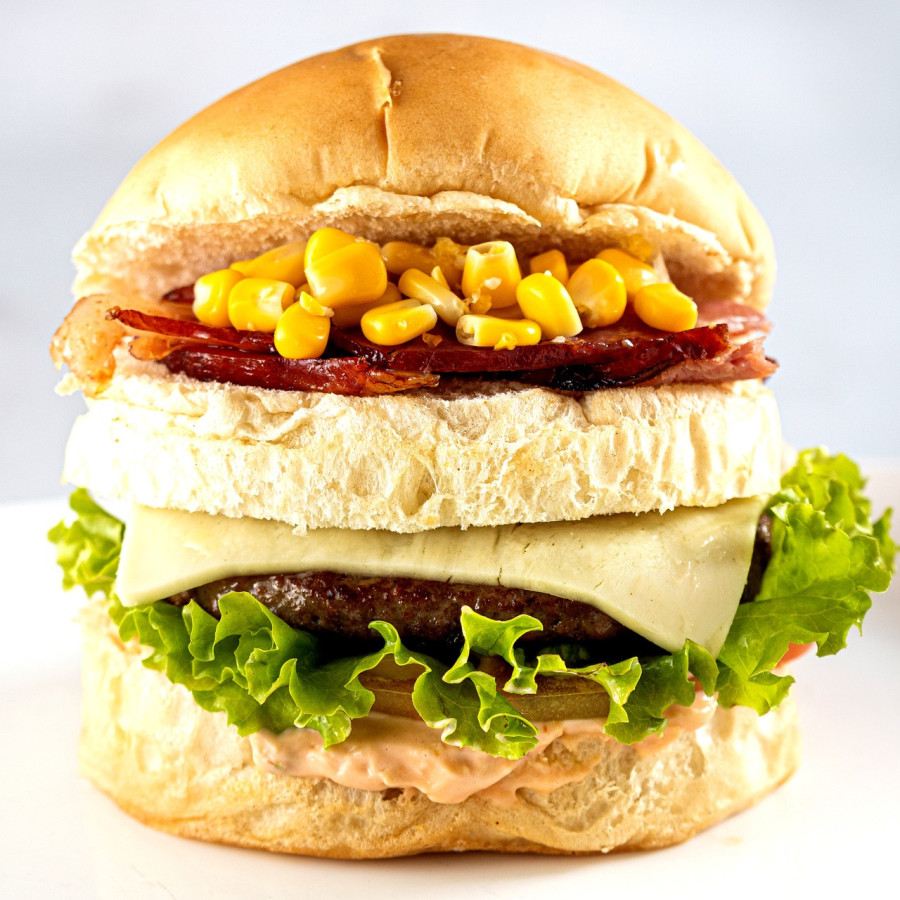 Hambúrguer de boi, queijo derretido, bacon crocante, milho verde, molho rosado e tomate fresco.