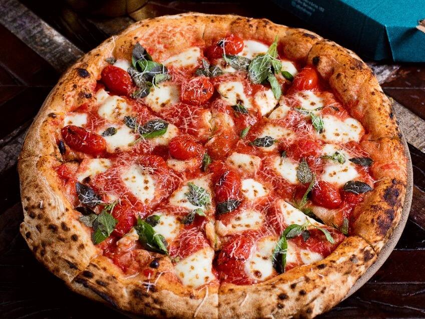 Nosso molho de tomate, scamorza de búfala, tomate cereja vermelho e raminhos de manjericão e grana padano.