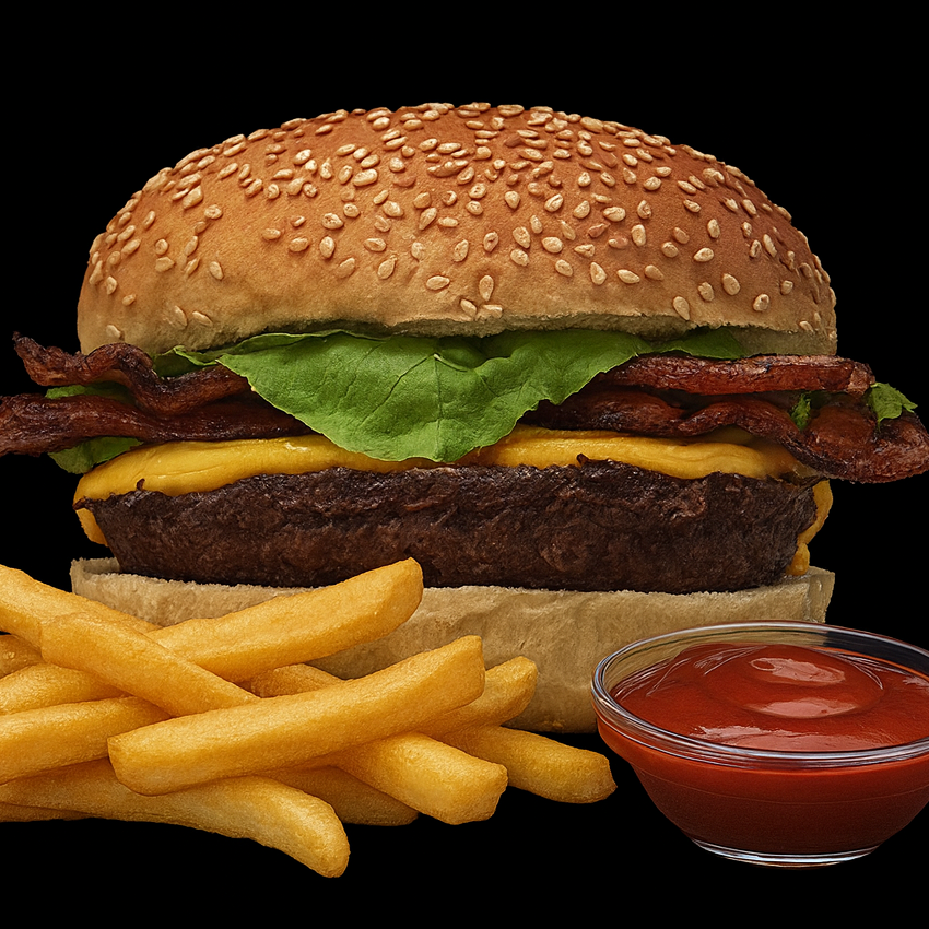 Blend El Toro 200g Angus Grelhado na Brasa, Queijo Prato Especial, Bacon Defumado Crocante, Cebola Roxa Caramelizada no Shoyo, Folhas de Rúcula, Maionese e Pão com Gergelim. Acompanha Bata Frita e Molho a sua escolha.