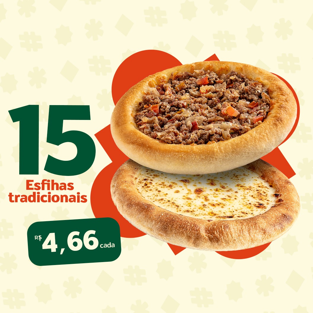 Satisfação Total: Desfrute de 15 deliciosas esfihas tradicionais. O combo perfeito para dividir com os amigos ou para uma refeição completa e cheia de sabor!