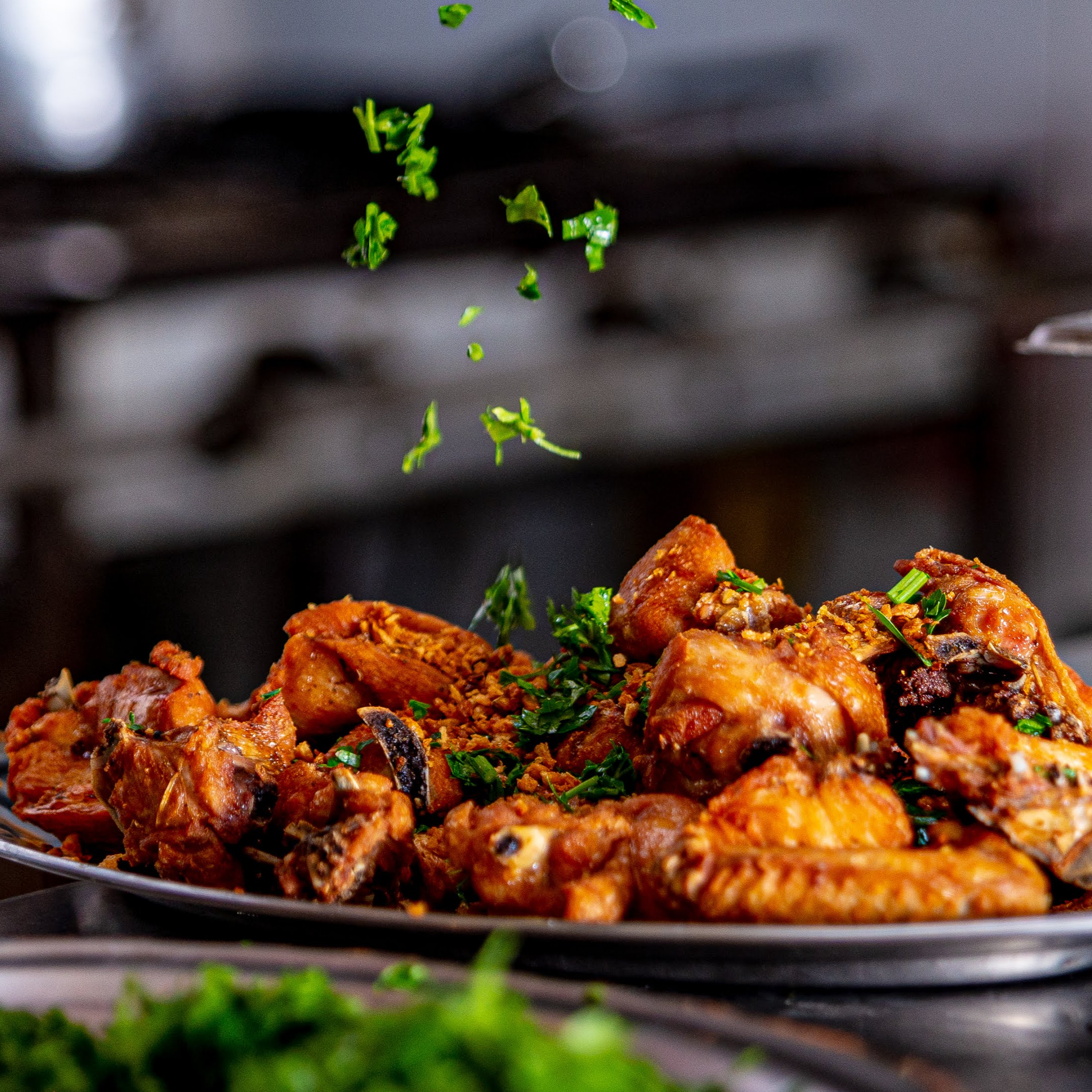 Frango inteiro temperado e assado na brasa, acompanha farofa.