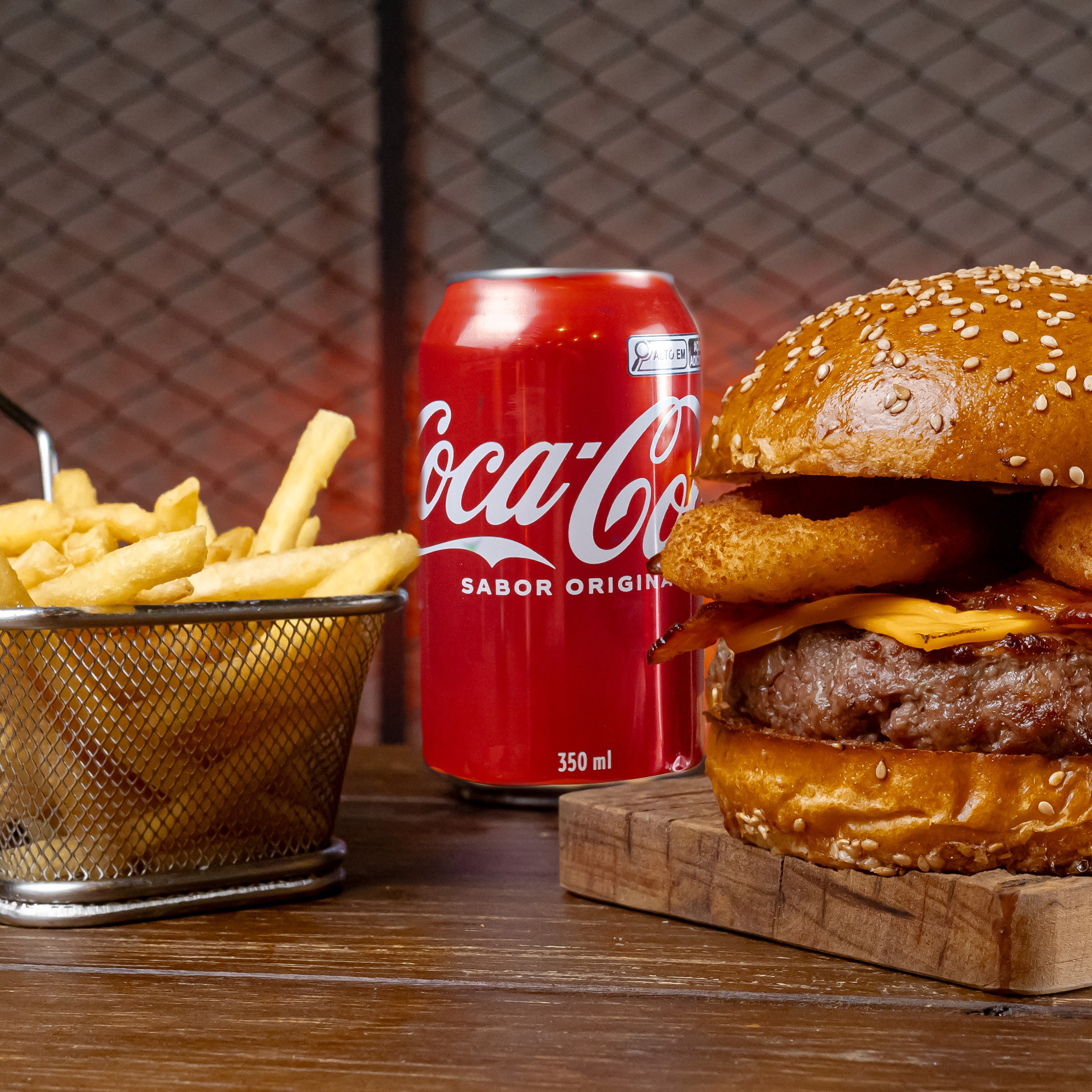 Blend de 180g (in natura), queijo cheddar, bacon e 3 anéis de cebola empanados. Acompanha batata frita e bebida.
