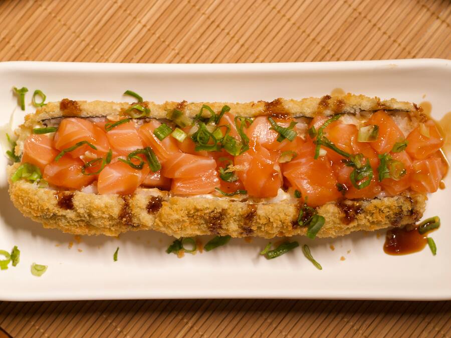 Cachorro quente japonês, empanado, de cerca de 20cm com arroz, cream cheese, teriaky e recheio à sua escolha: salmão | camarão | atum