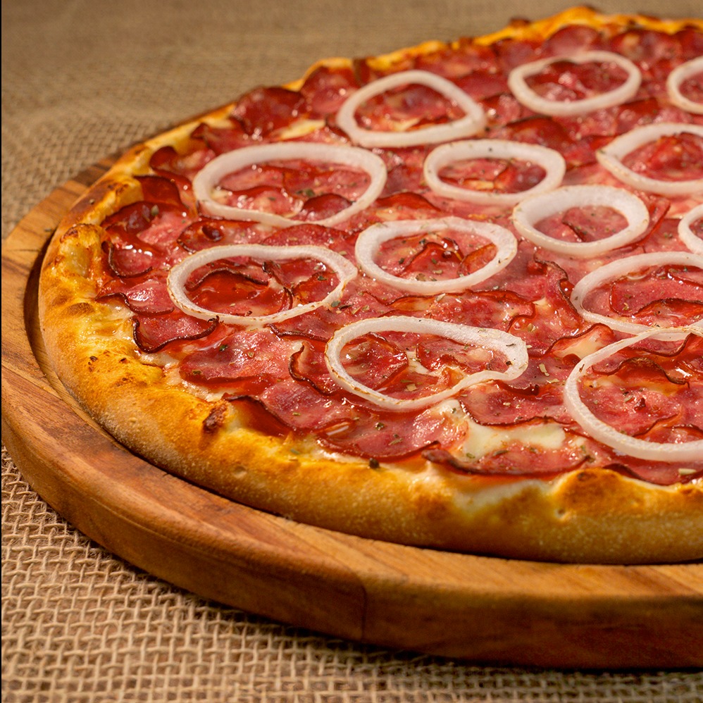 Massa de longa fermentação, molho pomodoro italiano, mussarela, calabresa, cebola e orégano.