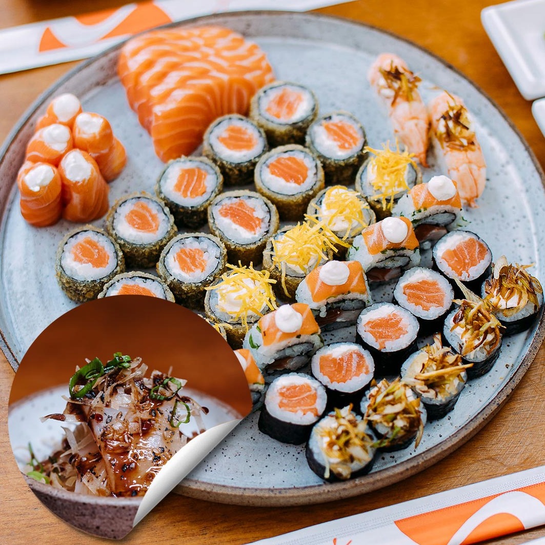 Arroz Japonês, Ice Hot, Cream Cheese, Crispy de Baroa, SBowl de Arroz Japonês, Sashmi de Salmão Ice empanado, Cream Cheese, Crispy de Baroa, Sunomono, Chips de Skin e Molho do Chef. Finalizado com Mix de Gergelim e Cebolinha.unomono, Chips de Skin e Molho do Chef. Finalizado com Mix de Gergelim e Cebolinha.