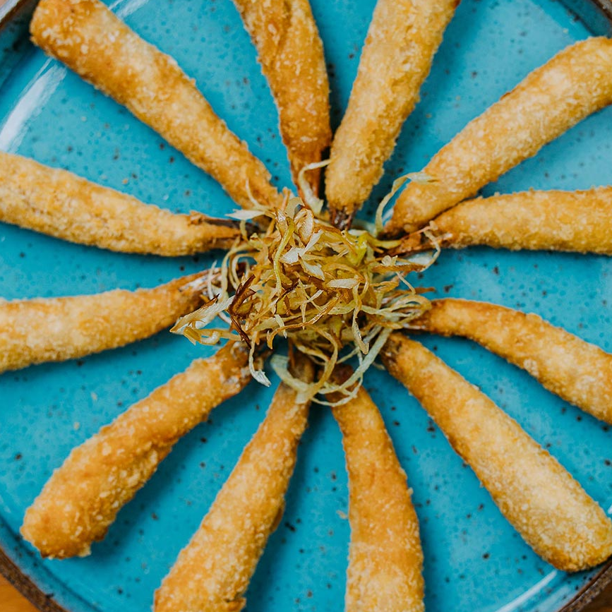 Cone de alga empanado, recheado com Arroz Japonês, Salmão e Cream Cheese.