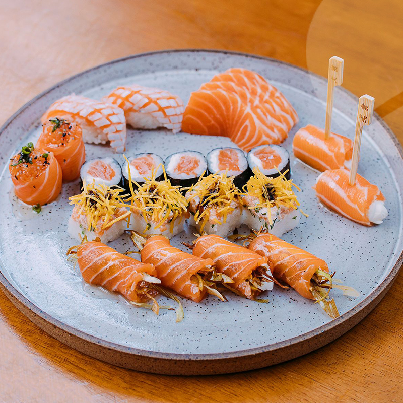 2 Gunkan de Salmão + 2 Sushi de Barriga de Salmão com Azeite Trufado + 4 Baterá de Salmão Crispy + 4 Sashimi de Salmão + 4 Salmão Ice Premium + 2 Pirulito de Salmão Trufado + 5 Philadelphia