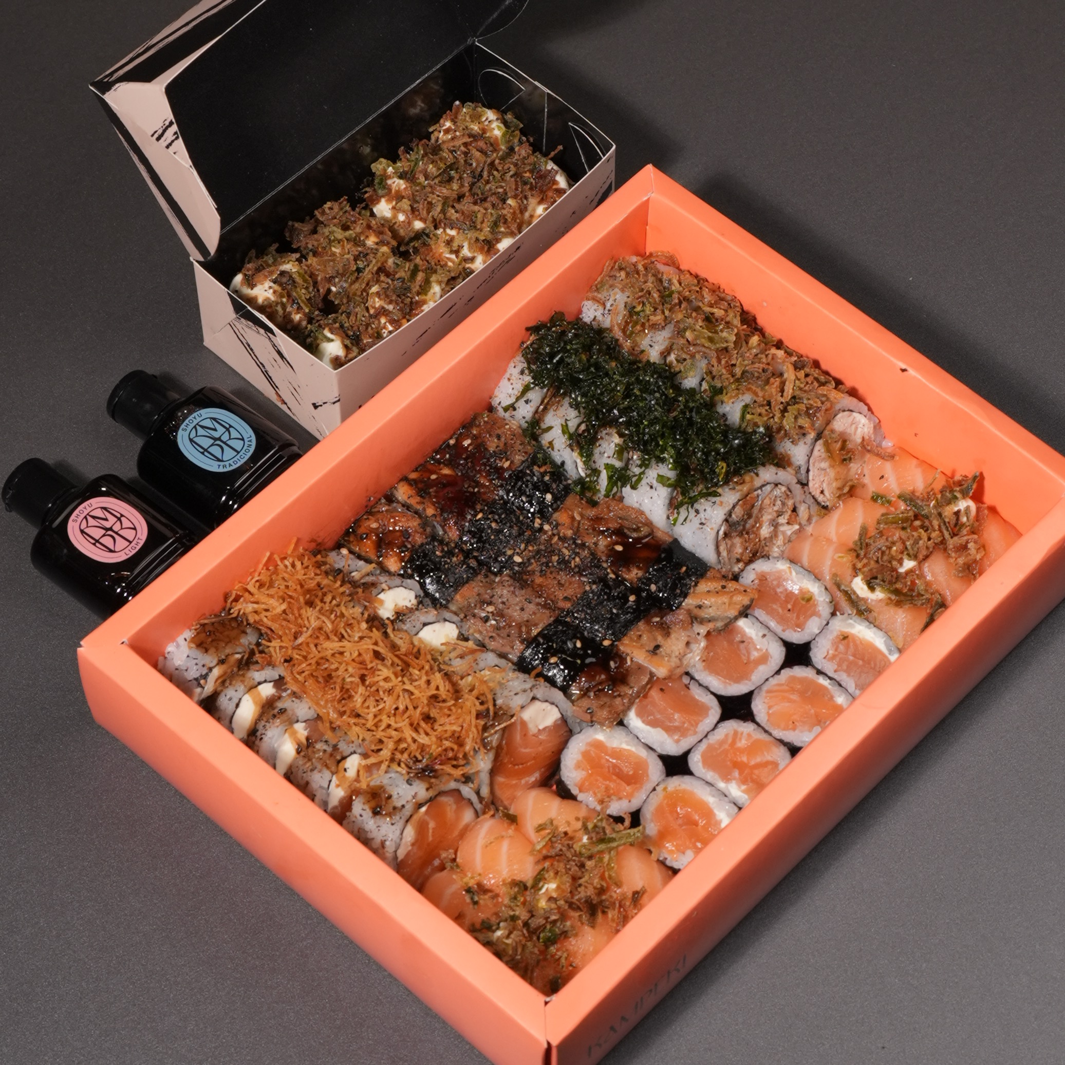 - 12 sashimis (escolha entre: salmão, peixe branco ou atum); - 10 uramaki crispy de palha doce com molho tarê; - 10 uramaki shake ebi com geleia de pimenta; - 6 niguiris variados; - 4 gunkan filadélfia (NÃO É POSSÍVEL FAZER TROCAS; INDICAR NAS OBSERVAÇÕES DO COMBINADO CASO DESEJE RETIRAR ALGUM MOLHO)