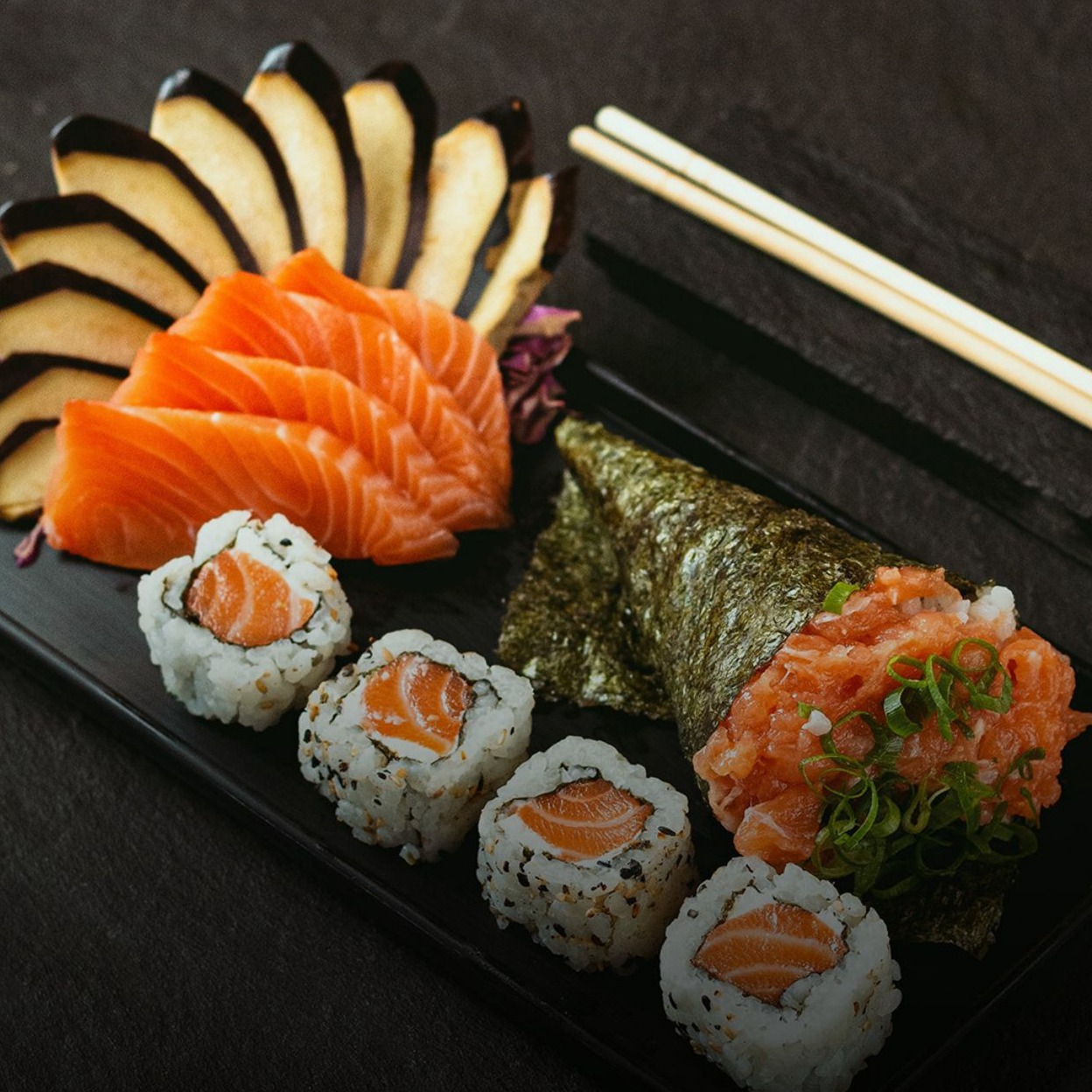 temaki 70 gr, 4 uramaki salmão com cream cheese, 4 sashimi de salmão acompanha padrão 1 hashi e 2 shoyu. Algo a mais pode ser adiciocional, valores estara discrito em cada item