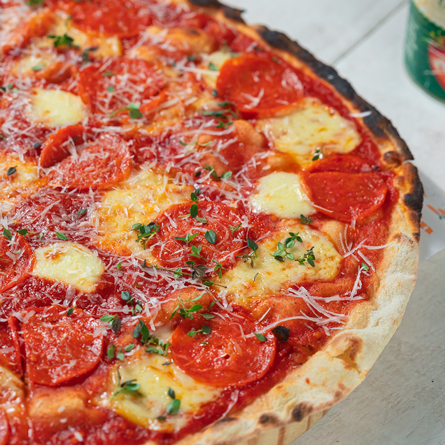 Base di pomodoro, fatias de salame pepperoni, queijo mozzarella & provolone, finalizada com parmesão e tomilho.