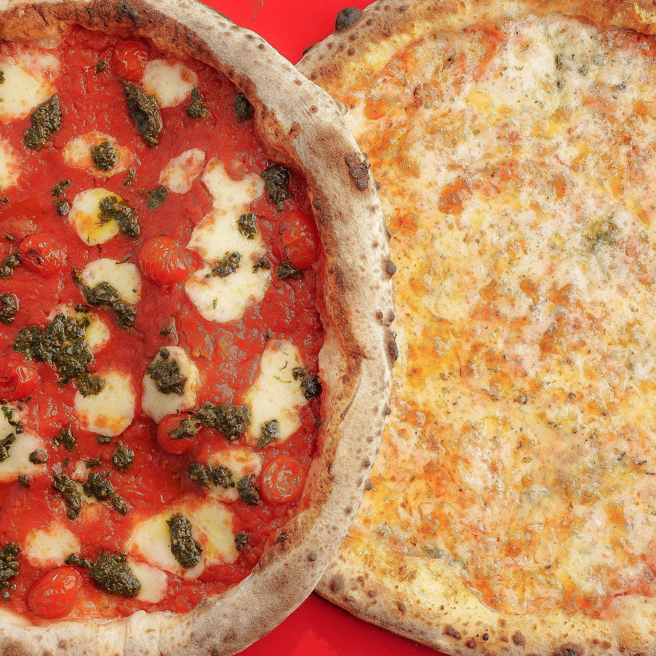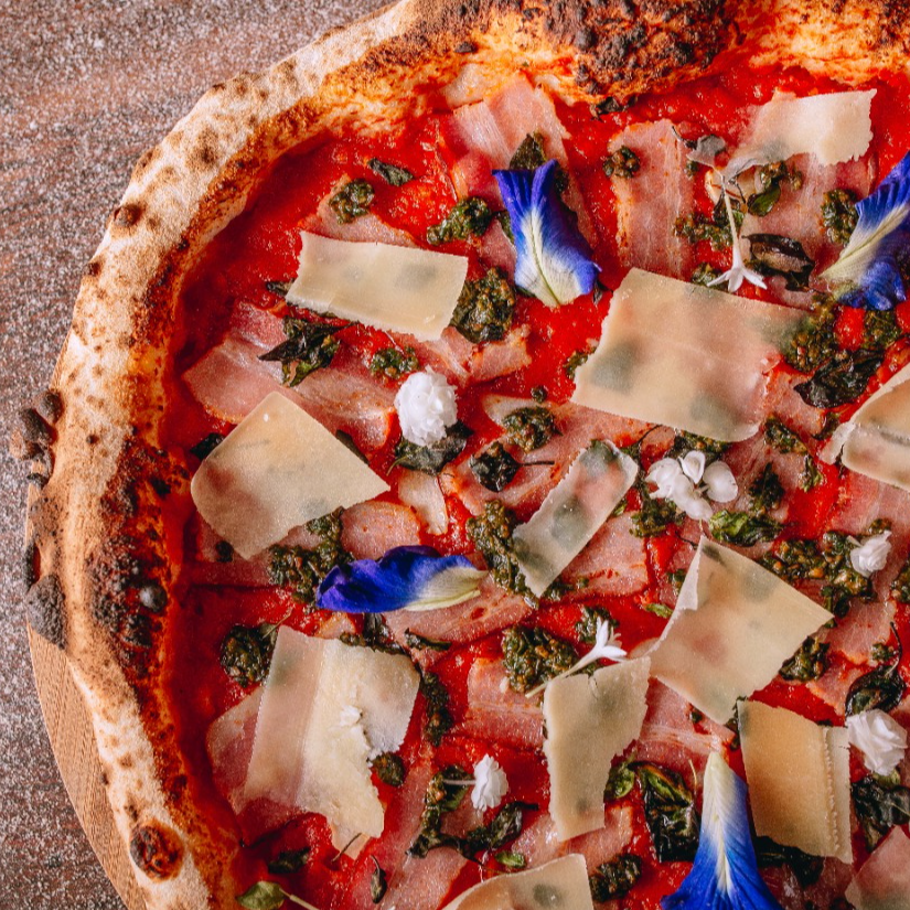 Molho de tomate, muçarela artesanal, frango desfiado e finalizada com molho de yogurte com hortelã. Massa de longa fermentação (até 72h), feita com farinha italiana 00. Pizza de 30cm, 6 fatias.