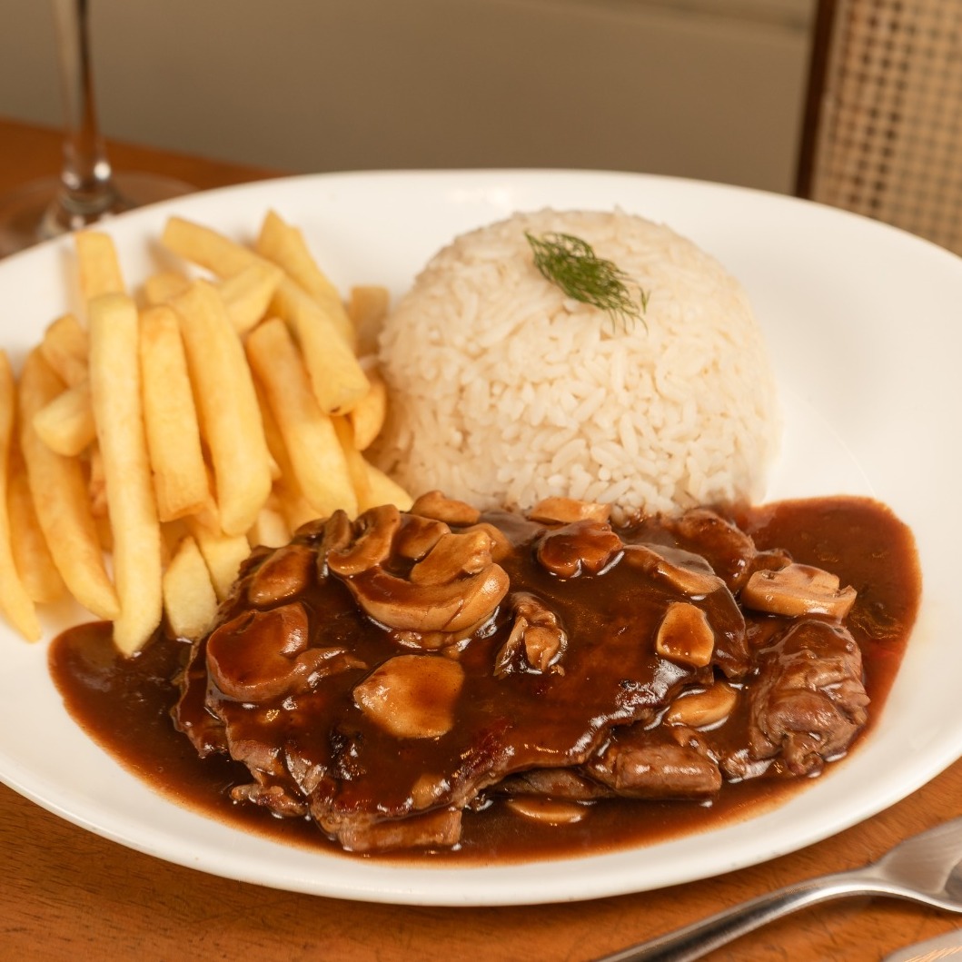 Finos escalopes de filé mignon servido com molho champignon, limão ou manteiga, acompanhado de arroz branco e batata frita. Sugestão para 1 pessoa.