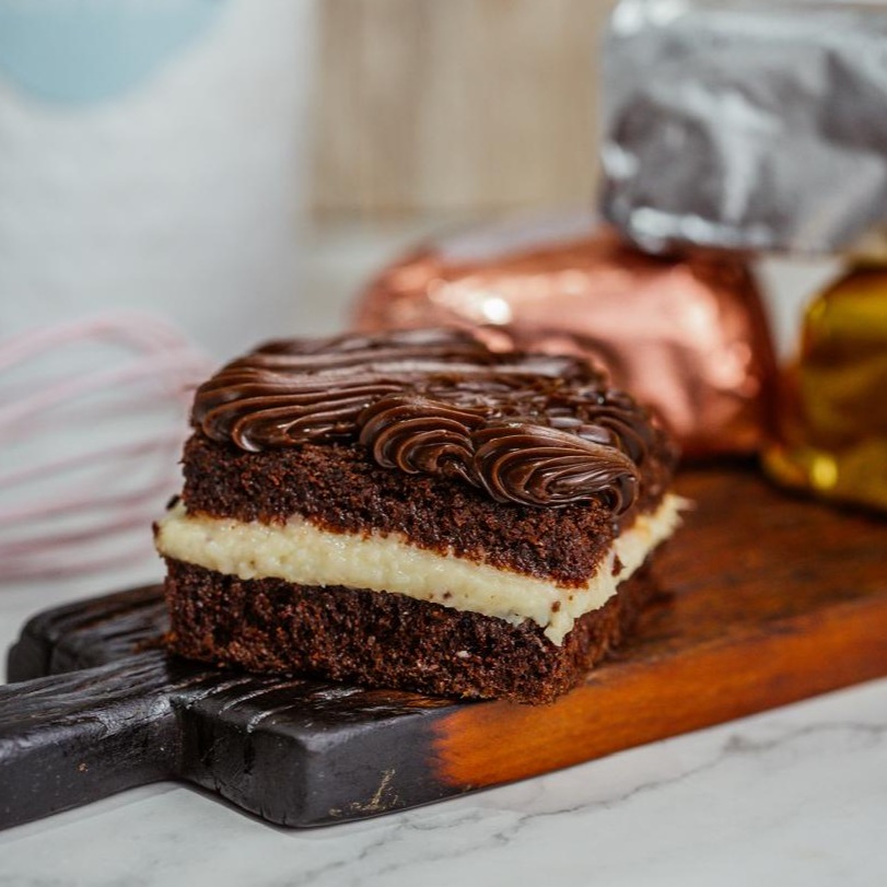 Aquele bolinho gelado que lembra nossa infância. Massa de chocolate, bem molhadinho, recheado com um delicioso e cremoso creme de coco, finalizado com brigadeiro. Cada pedaço pesa em media 100 gramas.