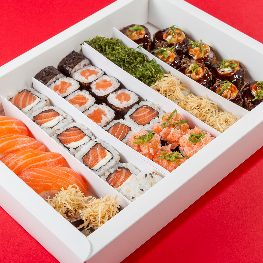 Serve 2 a 3 pessoas ❤ 6 uramaki filadélfia, 4 niguiri de salmão, 4 castelinho, 8 shake maki, 8 hot roll, 3 uramaki skin filadélfia com crispy de couve, 3 uramaki skin filadélfia com crispy de batata doce, 2 uramaki salmão, 2 hossomaki patê de salmão com crispy de batata doce. Caso deseje acompanhamentos (shoyu, hashi, wasabi e gengibre) selecionar ao final da compra. ❤