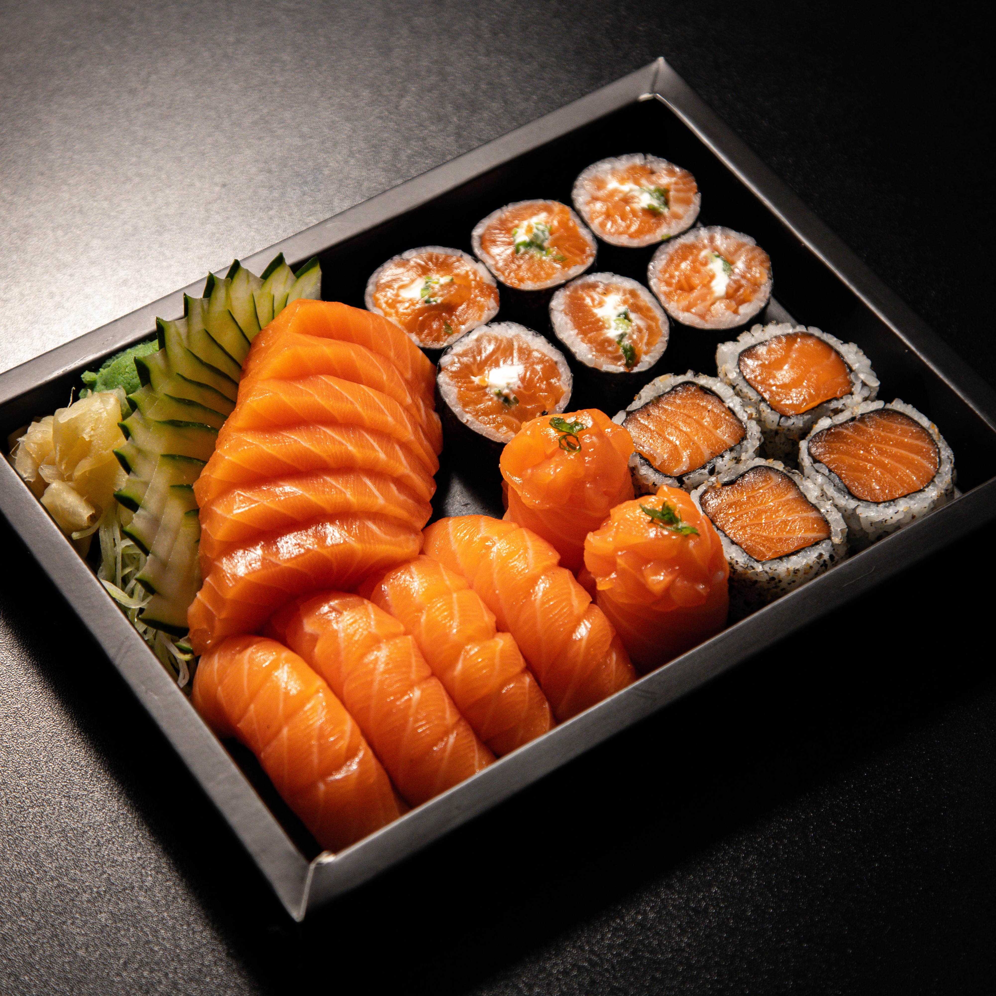 6 sashimis de salmão, 4 niguiris de salmão, 6 hossomaki philadelfia light, 4 uramaki de salmão, 2 dyo de salmão com pimenta schirachi (levemente picante).