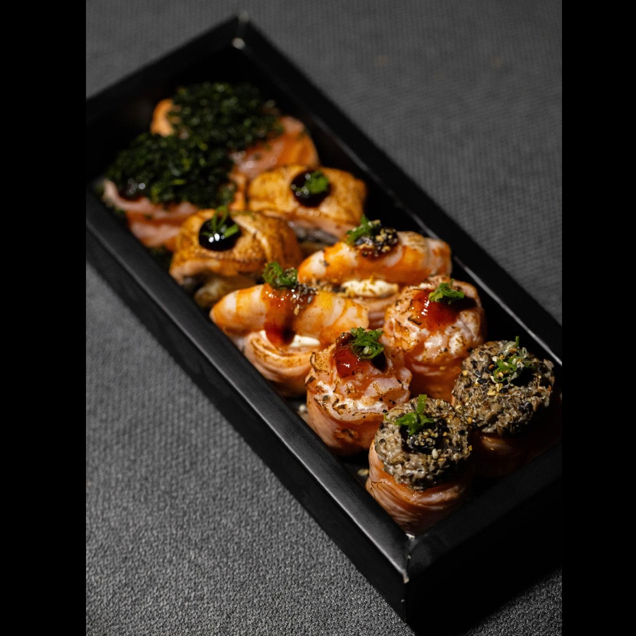2 uramaki ebiten especial, 2 dyo de salmão com cream cheese, 2 dyo de shimeji com cream cheese, 2 silvana maki, 2 otta maki (recheio de camarão com cream cheese) finalizado com crispy de couve. Todas as peças são maçaricadas.