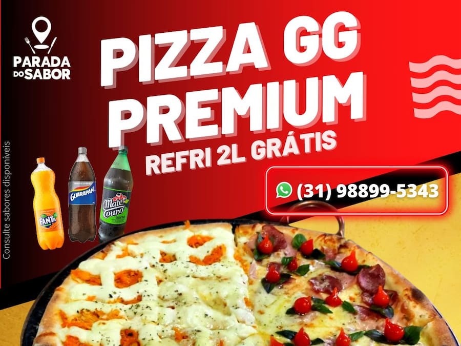 Comprando uma pizza gigante, você ganha um refrigerante 2 litros ou 1,5L (de acordo com a disponibilidade em nossa loja). Massa artesanal (fabricação própria), aberta e recheada na hora. Todas as pizzas salgadas possuem a base com molho de tomate da casa e queijo mussarela. Obs.: Não fazemos trocas de ingredientes. Foto ilustrativa.