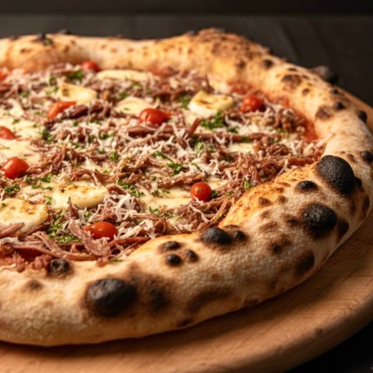 Como a carne seca desfiada na vida, somos fortes e suaves ao mesmo tempo. Molho San Marzano artesanal, mussarela de búfala derretida e carne seca desfiada com maestria. Finalizada com queijo coalho, pimenta biquinho e o dourado da manteiga de garrafa artesanal. Um tributo ao nordeste em forma de pizza!