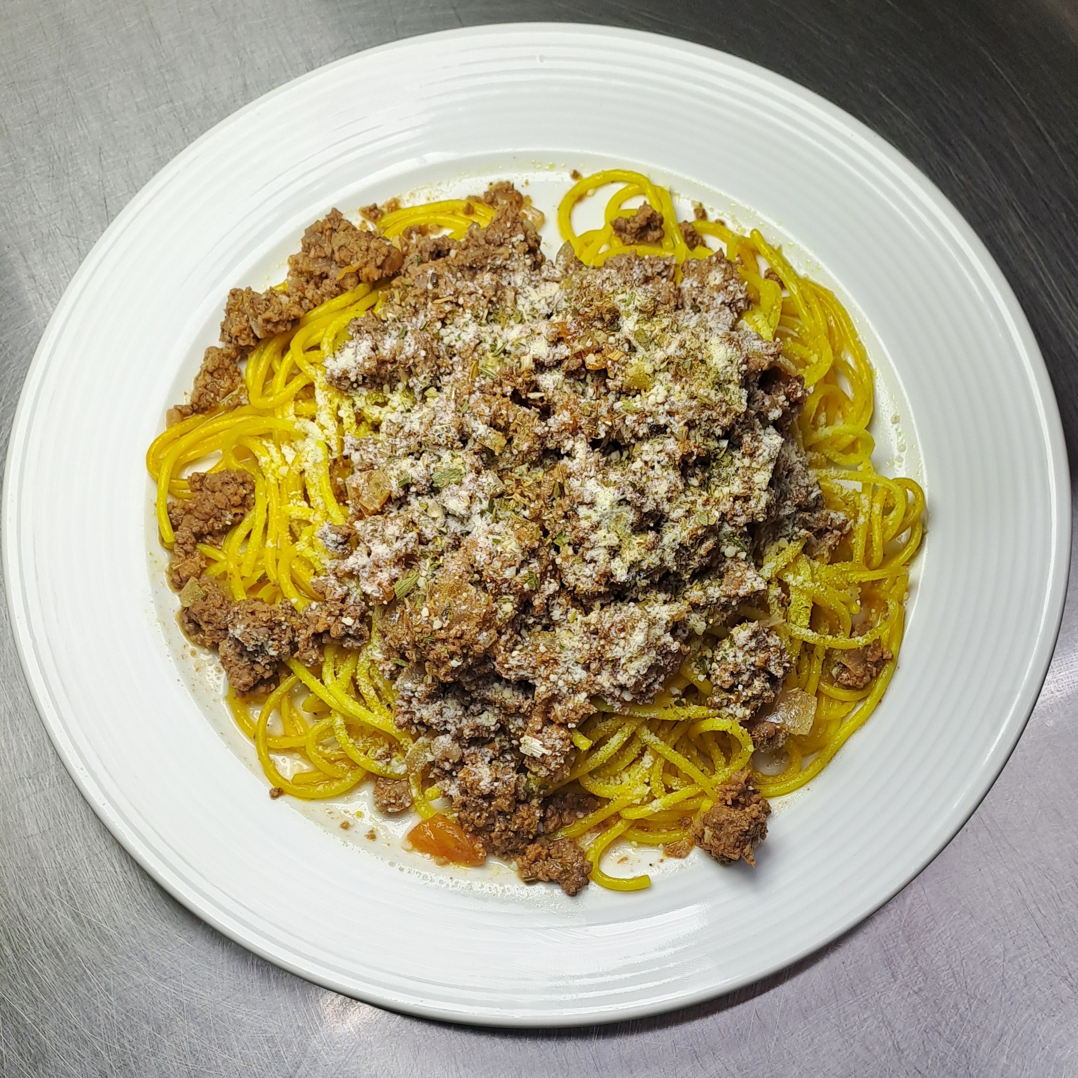 Macarrão al dente bolonhesa feito com carne moída bem temperada, queijo ralado e salsa. Porção individual.