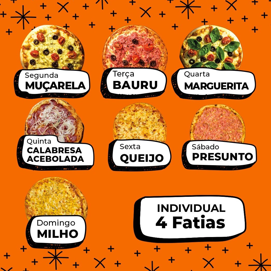 22 cm - 4 fatias Cada dia um sabor no Precinho pra Você!!! Segunda - Muçarela Terça - Bauru Quarta - Marguerita Quinta - Calabresa Paulistana Sexta - Queijo Sábado - Presunto Domingo - Milho