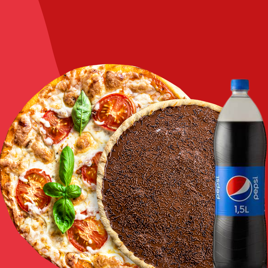 Uma Pizza Família de 35 cm, uma broto doce tradicional de 20 cm e um refrigerante de 1,5l (Pepsi ou Guaraná Antarctica). *Válida em sabores únicos: mussarela, calabresa, marguerita ou alho.