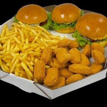 3 x burguer ou x salada porcao de batata 400g porcao de nuggets 400g -molhos refrigerante 2 litros