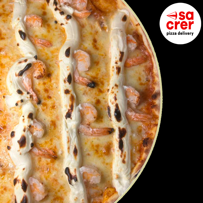 Molho de tomate, mussarela, camarão G cozido e eviscerado e Cream Cheese.