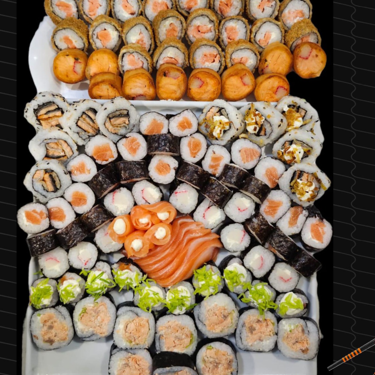 6 Philadelphia, 6 shakemaki, 6 uramaki chili roll, 6 shake roll poró, 3 skin roll poró ,3 skinteriaki , 5 sashimi salmão, 3 sashimi ice especial tost, 4 sashimi ice, 6 hot Philadelphia, 6 haruhot c/ camarão, 6 haruhot de salmão. ACOMPANHA 2 SHOYOS 40ML E 1 TERIYAKI 20ML