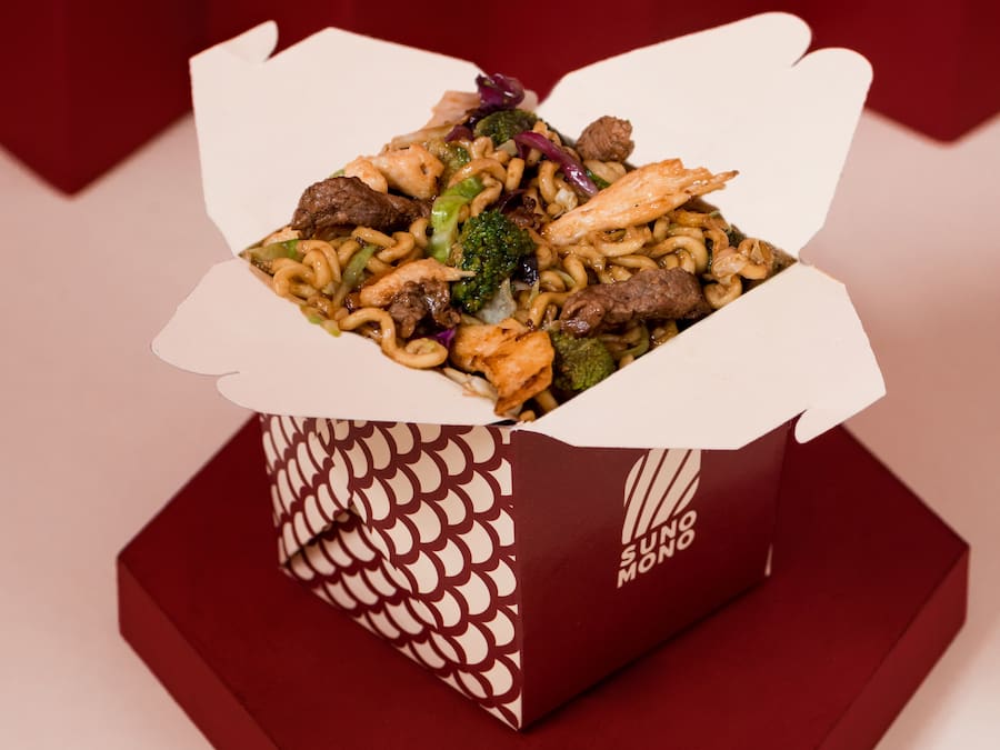 Macarrão oriental, frango, carne, repolho roxo, repolho verde, cenoura, brócolis americano e temperos especiais. Disponíveis nos tamanhos: Médio (400g) ou Grande (600g).
