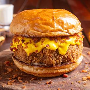 Um delicioso burger com carne de 170g empanado em farinha crocante, coberto com cheddar cremoso e bacon triturado em um pão brioche leve e saboroso, acompanhado de maionese SH.