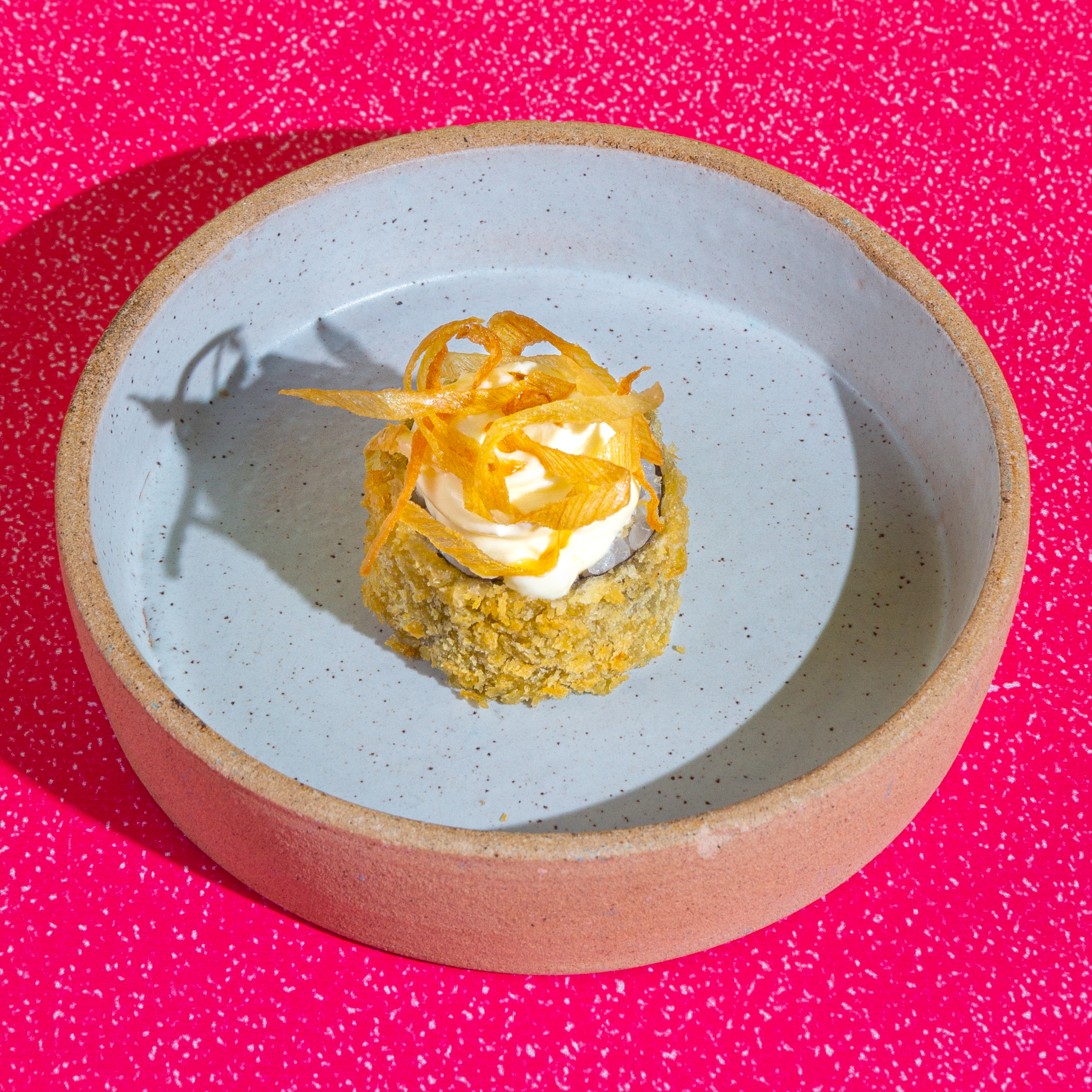 Atum empanado na leve farinha Panko, Servido sobre uma base cremosa de Maionese de Avocado e toque final de Tamago Trufado. São 5 fatias laminadas para quem aprecia a sofisticação da culinária japonesa!