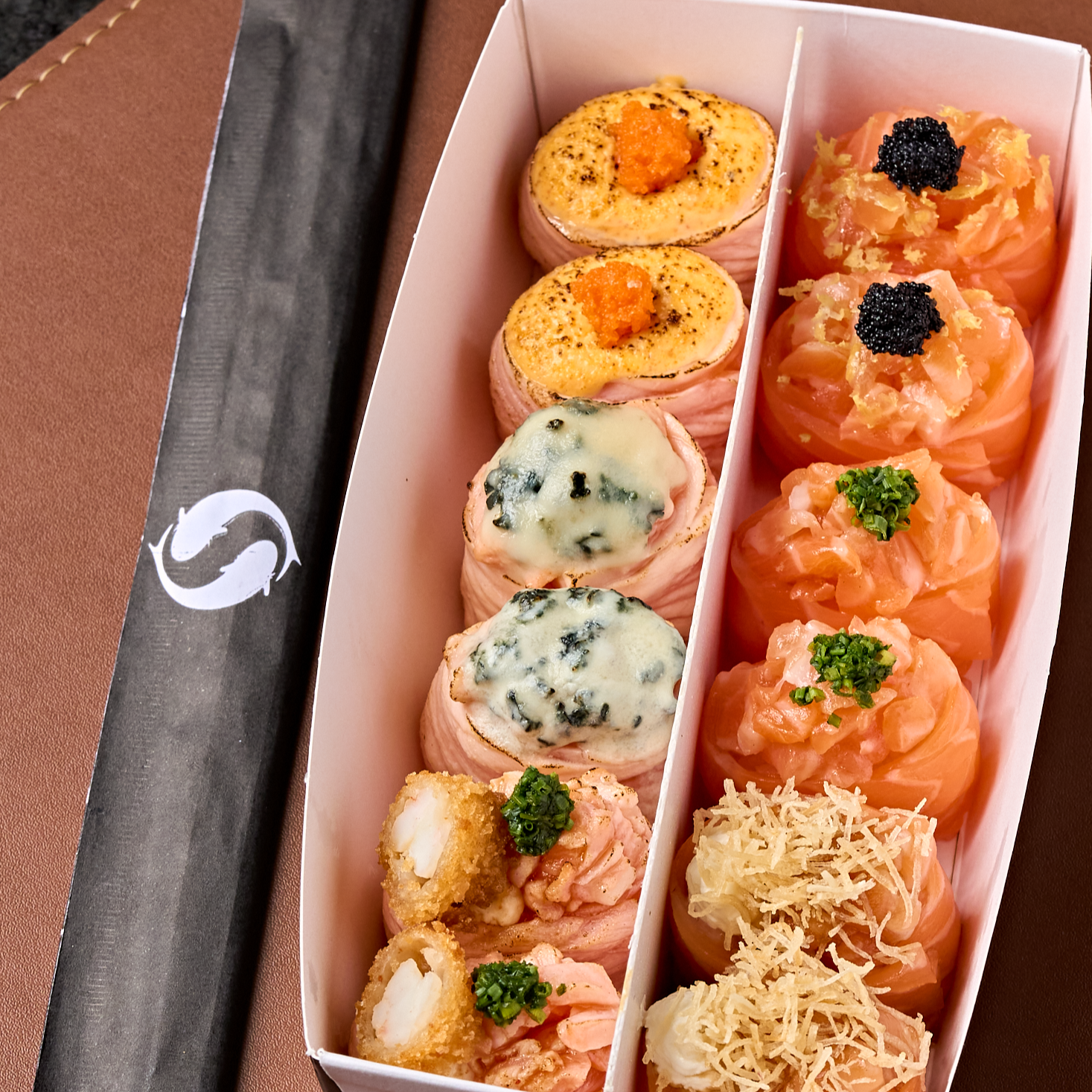 120g Salmão, cebolinha, gergelim branco, cebola roxa, cogumelos na manteiga, grãos de edamame, sunomono e manga. Acompanha 2 crispys, palha, couve ou alho poró.