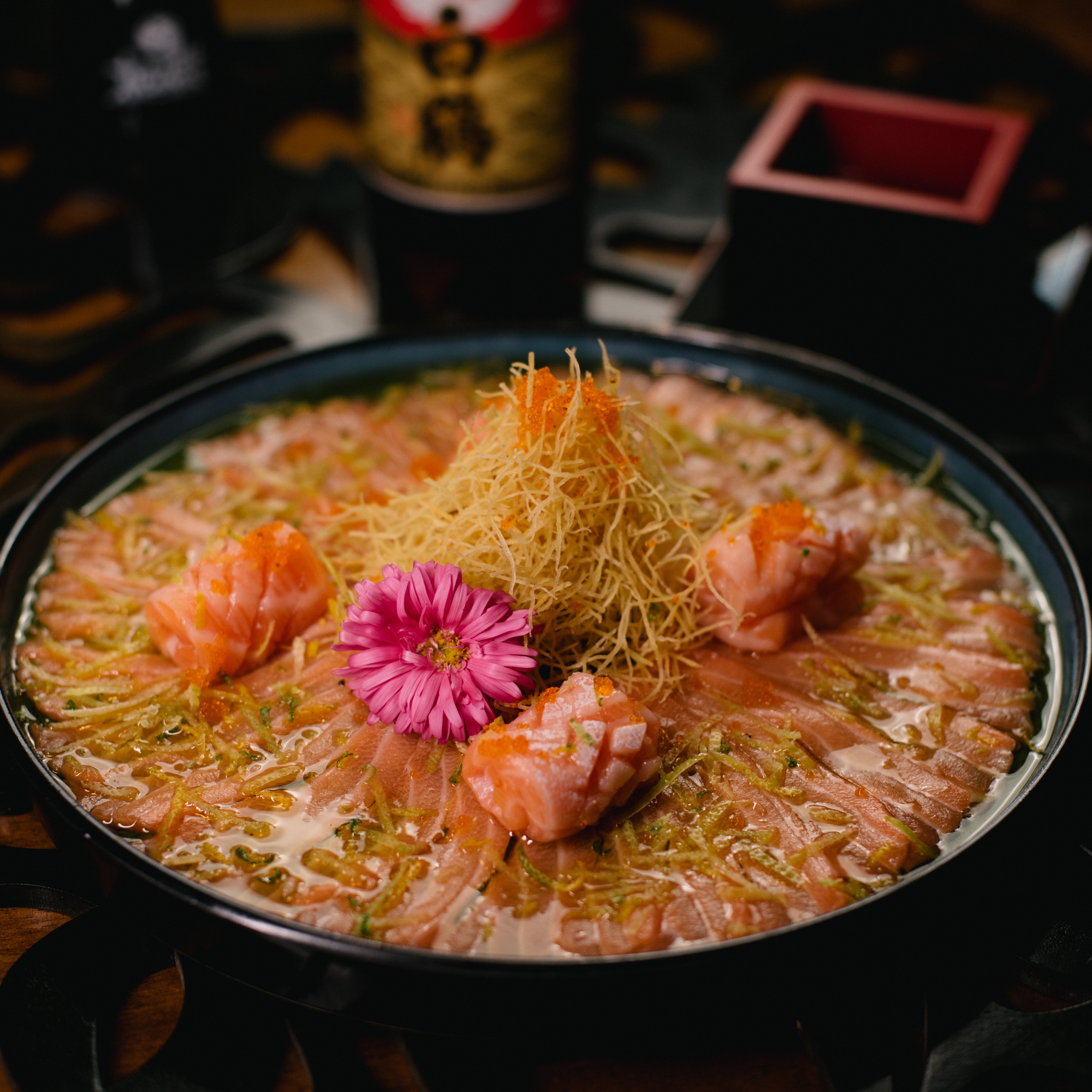 Finas fatias de salmão com especiarias, punzu trufado. !!! NÃO FAZEMOS ALTERAÇÕES OU TROCAS EM NOSSOS PRATOS.!!!