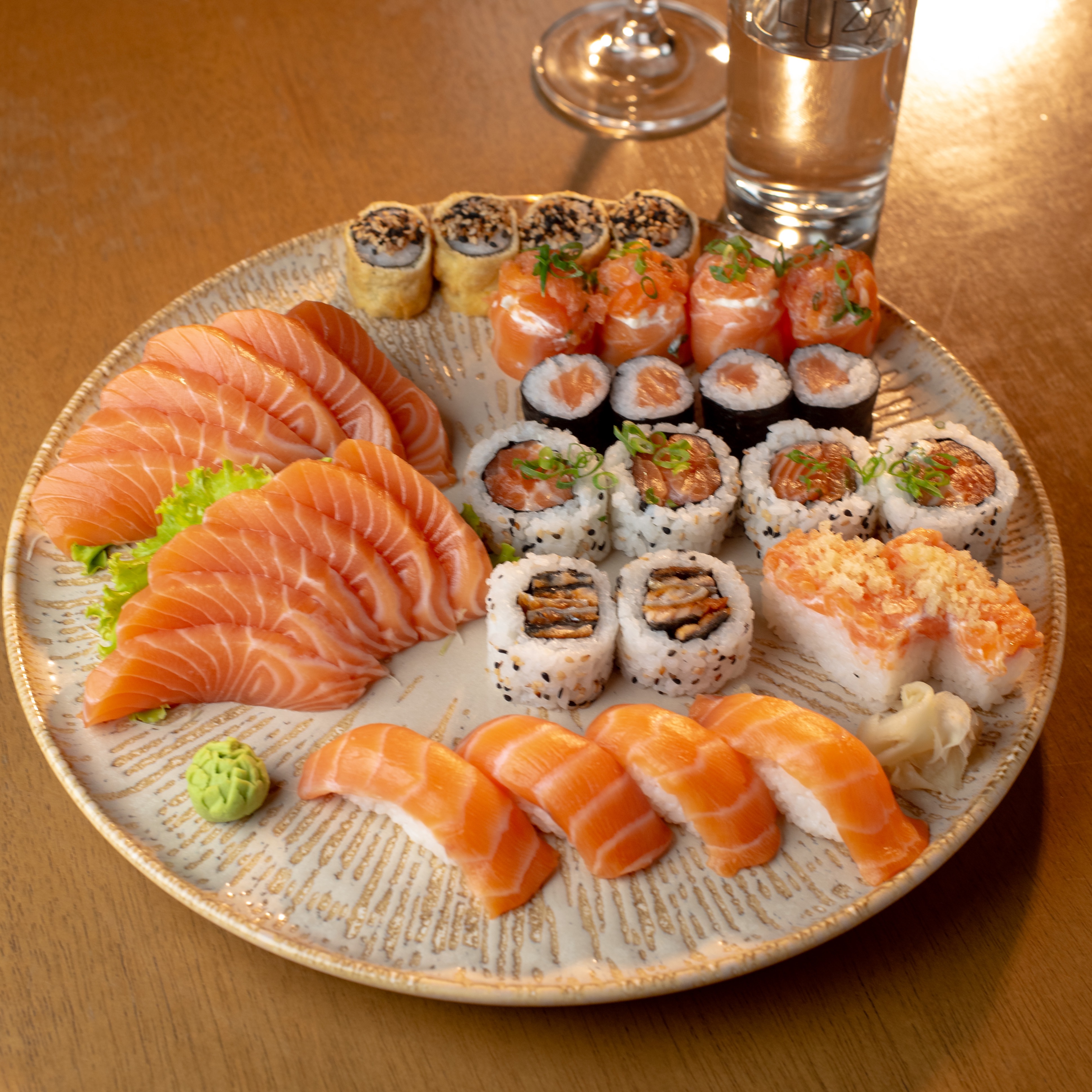 12 sashimis, 4 niguiris, 2 baterás, 4 makizushis, 4 uramakis, 2 uramakis skin, 4 gunkas e 4 hot rolls. !! NÃO FAZEMOS ALTERAÇÕES OU TROCAS EM NOSSOS PRATOS.!!!