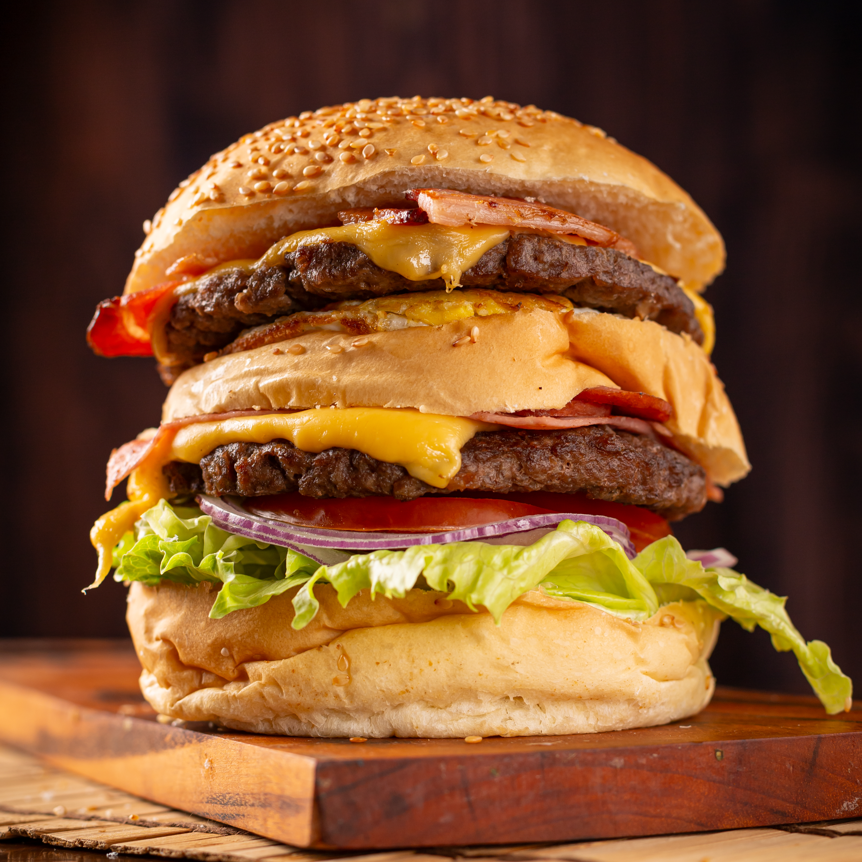 Pão de hambúrguer com gergelim, 02 hambúrgueres artesanais 160g cada, alface americana, cebola roxa, tomate, ovo, bacon, presunto, calabresa, queijo prato e maionese. * Acompanha uma deliciosa fritas McCain