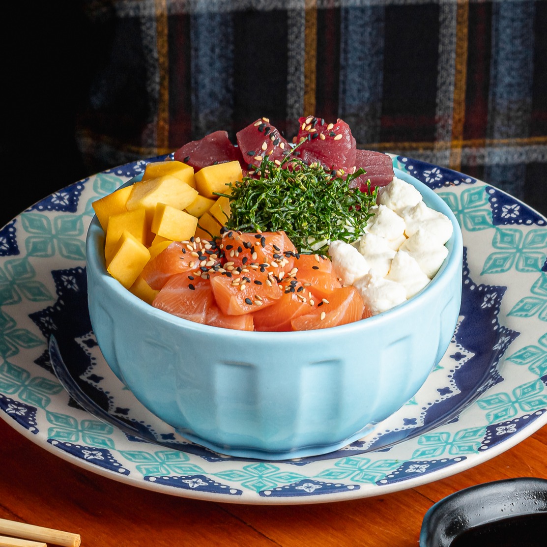 Salmão, atum, cream cheese, manga, crispy de couve e gergelim... Deliciosos cubos de atum e salmão. O cream cheese adiciona uma textura cremosa e acentua os contrastes, enquanto a doçura tropical da manga equilibra os sabores. Para uma experiência de texturas, acrescentamos o crispy de couve, proporcionando uma crocância única, finalizado com o toque de gergelim crocante. Poke médio (peso total 350g - sendo 60g de proteína aprox.) Poke grande (peso total 550g - sendo 100g de proteína aprox. )