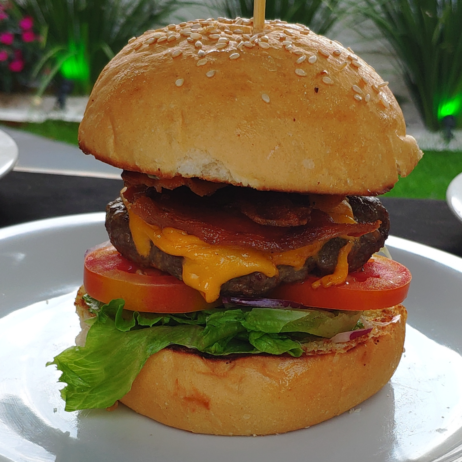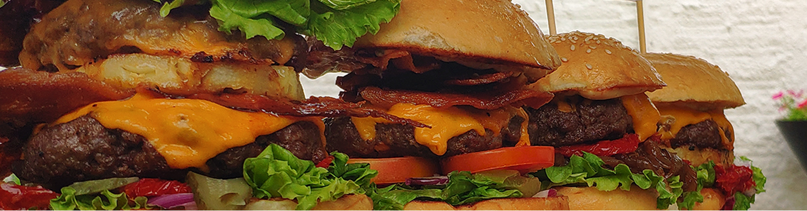 Cada Bacon Cheese Burguer contem 160g de hambúrguer bovino, queijo cheddar, bacon crocante, tomate, cebola roxa, alface e molho.
